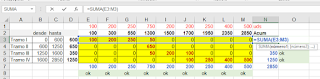 En las celdas en verde (rango E8:M8) añadimos un control para verificar que las unidades repartidas por tramos en el periodo coinciden con las unidades vendidas: